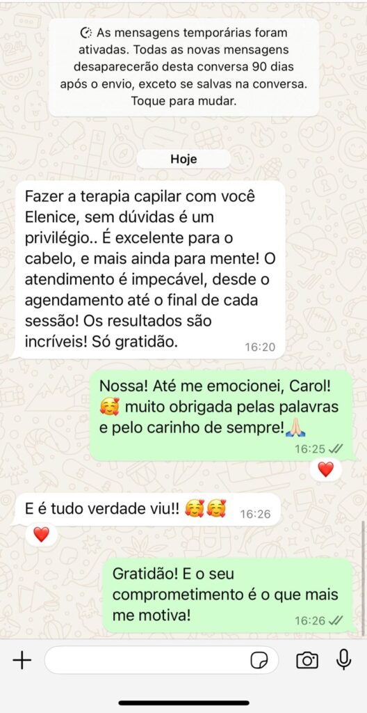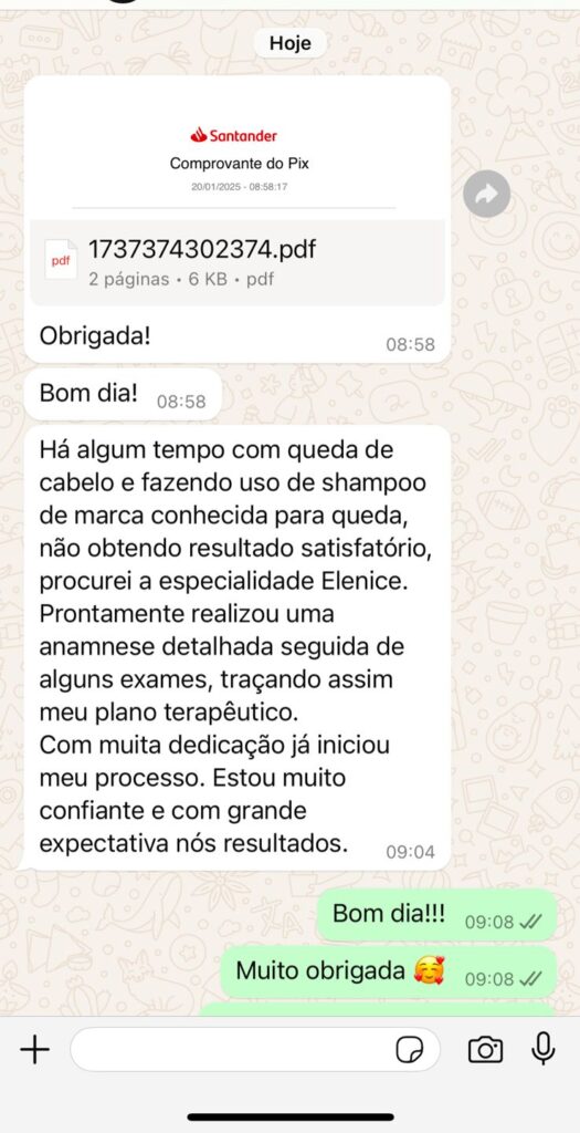 Com terapias avançadas da tricologista, orientações detalhadas e um acompanhamento próximo, meu objetivo é ajudar você a redescobrir a força, a vitalidade e a saúde dos seus cabelos – transformando, junto com isso, a forma como você se sente ao se olhar no espelho.
